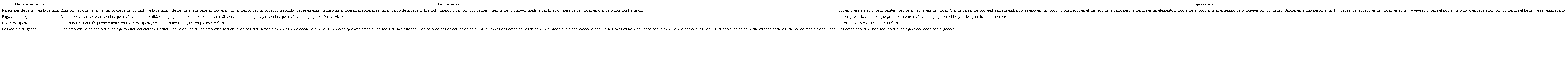 A pesar de los avances en materia de género, los roles dentro de la dinámica del hogar han permanecido estáticos. Este aspecto influye en el ámbito económico de las empresarias, ya que no pueden dedicar el tiempo que quisieran a sus empresas, limitando a su vez la diversificación, es así que, la dimensión social permea en la económica y viceversa, porque hay empresarias que quisieran que sus empresas continuaran creciendo, pero no han podido lograrlo porque perciben que descuidan a su familia.