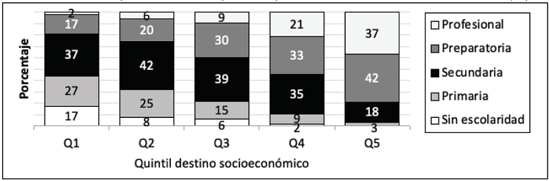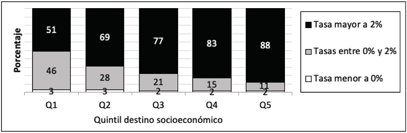 En referencia a la escolaridad, la Gráfica 1 muestra que el porcentaje de personas con estudios de preparatoria y profesionales abarca el 19% del total de individuos que integran quintil 1 de riqueza destino, pero este porcentaje se incrementa cuando aumenta el nivel de riqueza -y por lo tanto a mayores niveles de bienestar económico- hasta el punto de conformar el 79% en el quintil 5. Por otra parte, la Gráfica 2 muestra que la presencia de personas que desarrollaron su carrera laboral en tasas de crecimiento económico mayores a 2% se incrementa, aumentado del 51% en el estrato más pobre hasta alcanzar el 88% del quintil más alto de riqueza. En síntesis, se observa que mayor crecimiento económico y mayor logro escolar están asociados con la obtención de niveles de riqueza superiores y, por lo tanto, mayores niveles de bienestar.