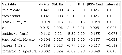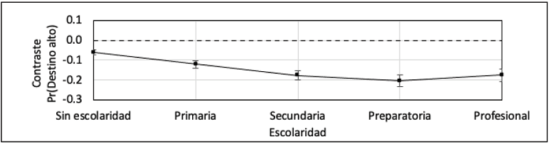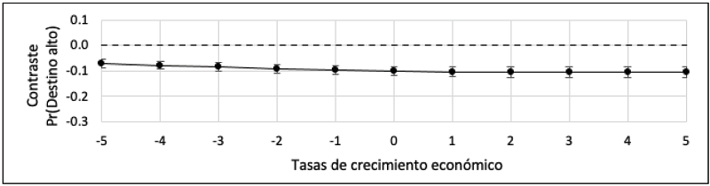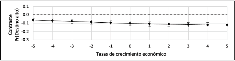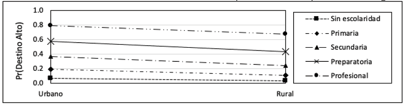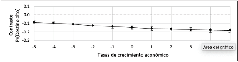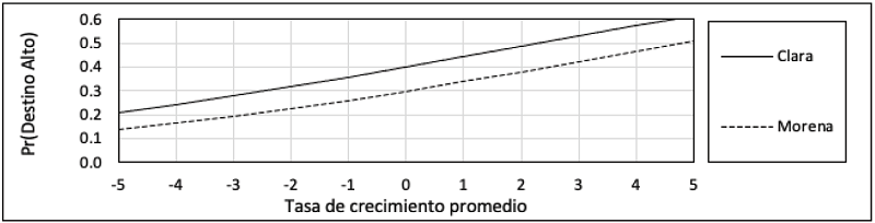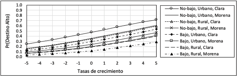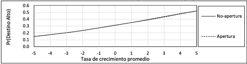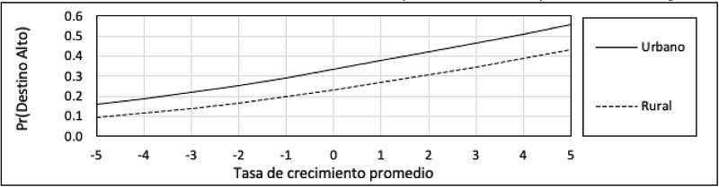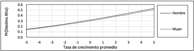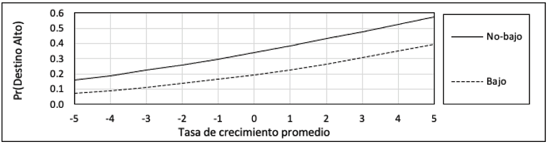 Los efectos marginales promedio (Cuadro 4) muestran que las características de nacimiento representan una ventaja/desventaja debido a que las probabilidades de alcanzar un destino económico alto son 11.5 puntos porcentuales menores para las personas provenientes del ámbito rural con respecto al origen urbano, 10.4 puntos porcentuales menores para las personas de piel morena en comparación a las personas de piel clara, y 16.8 puntos porcentuales menores para los hijos de hogares con origen económico bajo con respecto a los descendientes de estatus alto. En contraste, las probabilidades de destino alto se incrementan 3.2 puntos porcentuales con cada año adicional de escolaridad, y 4.2 puntos porcentuales por cada aumento unitario de la tasa promedio de crecimiento.