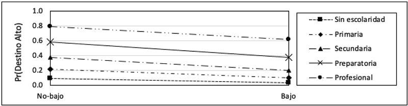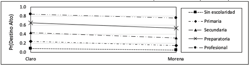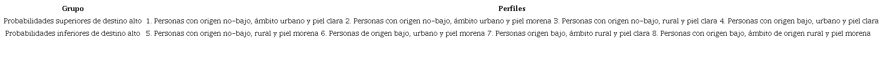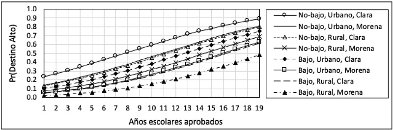 En ambas gráficas, el orden de quiénes son los más/menos beneficiados por el mérito escolar y económico es el mismo y las trayectorias de las curvas de probabilidad no se cruzan en ningún punto, señal de que no hay intercambio de posiciones en el orden de predilección por ocupar posiciones en la parte alta de la distribución socioeconómica. Destaca que el perfil con origen no-bajo, urbano y piel clara tiene amplia ventaja en las probabilidades de destino alto y la diferencia con respecto al resto de los perfiles es considerable. En contraste, las personas con origen bajo, rural y piel morena son quienes, tienen menores probabilidades de acceder a niveles de bienestar superiores con una desventaja sustancial. Por otra parte, algunos perfiles tienen probabilidades de logro muy similares (sus curvas de probabilidad son muy cercanas). De esta forma, podemos ordenar ocho distintos niveles de éxito, en dos categorías de mayor probabilidad de destino alto (niveles superiores) a menor probabilidad (niveles inferiores), como se muestra en el Cuadro 5.