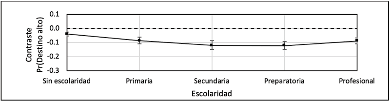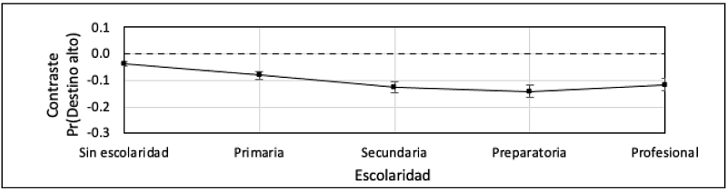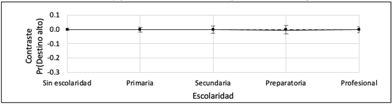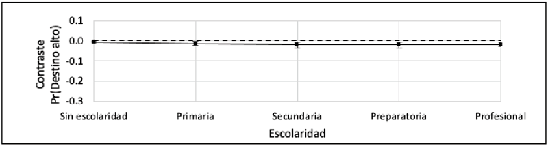 Las Gráficas 15 a 22 muestran el contraste estimado en las probabilidades de éxito socioeconómico para los distintos niveles de escolaridad y crecimiento económico.2 Sobresale que en todos los niveles académicos las diferencias tienen signo negativo, señal de que las probabilidades de logro para las personas de origen económico bajo, ámbito de origen rural y tono de piel morena son menores que para sus respectivas contrapartes. En las Gráficas 15, 16 y 17 se observa que el contraste de probabilidades de éxito se aleja de la línea punteada que indica la nulidad de las diferencias, por lo que se concluye que la brecha se amplía conforme aumenta el logro escolar, excepto en educación superior, nivel en el que la diferencia se reduce un poco con respecto al nivel preparatoria. Esto significa que el aumento marginal de la probabilidad de obtener un estatus económico alto, debido al aumento de la escolaridad, es menor para los grupos con desventaja de oportunidades que para sus respectivos grupos de comparación, por lo que se rechaza la hipótesis de convergencia y se concluye que el logro escolar tiene tendencia divergente. En cambio, en las variables sexo (Gráfica 18) y periodo económico de ingreso al mercado de trabajo (Gráfica 19) la magnitud del contraste es muy próxima al valor cero a través de los distintos niveles de escolaridad, prácticamente no muestra pendiente y las diferencias no son estadísticamente significativas, lo que indica que no hay diferencias de recompensas entre hombres y mujeres (efecto neutro).