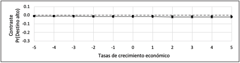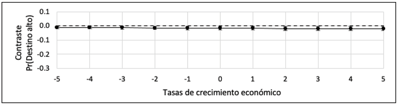 Las Gráficas 20 a 24 muestran que en las diferencias de probabilidades de éxito la trayectoria del contraste se aleja conforme aumentan las tasas promedio de crecimiento. En la comparación entre los grupos poblacionales de origen no-alto versus alto (Gráfica 20), tono de piel moreno versus clara (Gráfica 21) y ámbito de origen rural versus urbano (Gráfica 22) la curva de éxito se aleja del origen, señal de que predomina una tendencia divergente: el incremento de las tasas de crecimiento económico beneficia en mayor medida a las personas con origen socioeconómico alto, tono de piel claro y ámbito urbano. Las gráficas también muestran que el contraste de las probabilidades de destino alto por tono de piel y ámbito de origen tiene una pendiente menor en el contraste de probabilidades por origen socioeconómico, variable que muestra la mayor diferencia entre los grupos poblacionales de comparación. Debido al comportamiento descrito de las brechas de éxito, se rechaza la hipótesis de convergencia debido al crecimiento económico. Respecto al sexo y periodo de apertura comercial, la diferencia de probabilidades de destino alto es cero y no muestra cambios a lo largo de la curva (Gráficas 23 y 24).