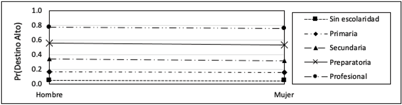 Las Gráficas 3 a 7 muestran las probabilidades estimadas de destino socioeconómico alto en cada nivel escolar a través de las distintas variables de interés1. Los ejes verticales indican la escala de probabilidades de destino alto; las líneas horizontales (punteadas o continuas) corresponden a los distintos niveles de escolaridad y en los extremos laterales de cada gráfica se ubican los grupos poblacionales en relación con su grupo de comparación. En la Gráfica 3 se aprecia que los hijos provenientes de hogares con estatus no-bajo tienen mayores probabilidades de logro que los descendientes de hogares con origen económico bajo, a pesar de que ambos han aprobado el mismo nivel de escolaridad. Las Gráficas 4 y 5 exponen el mismo comportamiento en todos los niveles escolares: probabilidades de éxito más altas en los originarios de ámbito urbano y piel clara que para los nacidos en un ámbito rural y piel morena, respectivamente. En las Gráficas 6 y 7 las curvas prácticamente no manifiestan algún tipo de pendiente, lo que significa que no hay indicios de diferencias en las probabilidades de logro por sexo y periodo económico.