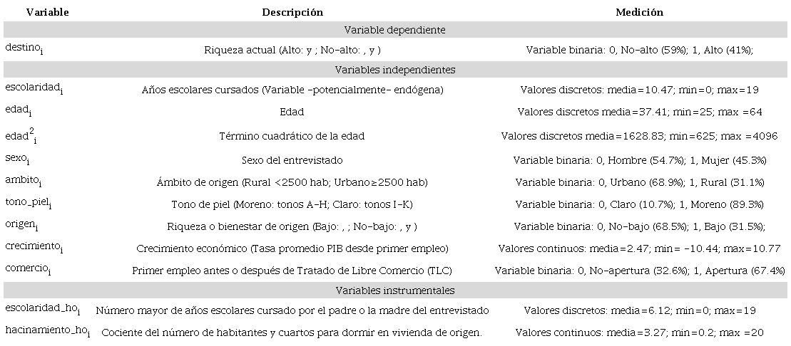 En el modelo objetivo planteado (ec.1) la variable dependiente es una variable no observable, pero puede ser reconocida si se le relaciona con el estrato de riqueza destino (Qi) en que se ubican los entrevistados. En el modelo propuesto se considera como éxito socioeconómico que el individuo acceda a la parte alta de la distribución, donde están los mayores niveles de bienestar, por lo que se define a la variable dependiente observable como una variable binaria asociada a cinco valores que expresan la posición en la distribución socioeconómica del individuo: si la posición socioeconómica del entrevistado se ubica en los quintiles altos de la distribución Q4 ó Q5 (destino socioeconómico alto) y si se ubica en los quintiles Q1, Q2 o Q3 o de la distribución (destino socioeconómico no-alto). Explícitamente, la propensión al quintil del estrato-destino se define como:
