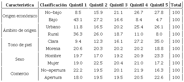 En cuanto al sexo y periodo de comercio, en ambos casos no hay diferencias notables en la forma en que se ubican hombres o mujeres y personas que ingresaron al mercado de trabajo antes o después de 1994: se distribuyen en una proporción cercana al 20% a través de los distintos quintiles. En resumen, el patrón de movilidad muestra que hay ventaja de oportunidades de obtener un nivel de bienestar económico alto para la población con origen no-bajo, ámbito de origen urbano y tono de piel clara, mientras que la población de origen bajo y ámbito de origen rural tienen menores oportunidades de un estatus distinto al de sus padres. Respecto al tono de piel morena, sexo y periodo económico de primer empleo los porcentajes no muestran tendencia alguna.