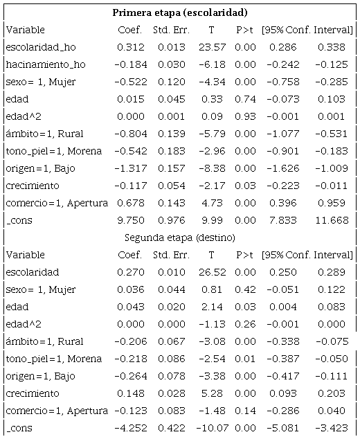 En la primera etapa de estimación (Cuadro 3) se observa que los instrumentos externos escolaridad_hoi y hacinamiento_hoi son estadísticamente significativos al 99% de confianza; lo que indica que la aportación de bienestar de los progenitores se transmite desde las condiciones habitacionales del hogar de crianza y el logro escolar del padre o la madre hacia el logro escolar de los hijos. Por otra parte, en la segunda etapa de estimación se identifica que -con al menos 5% de nivel de significancia- las covariables años de escolaridad, edad del entrevistado y crecimiento económico tienen efecto positivo sobre las probabilidades de alcanzar los estratos altos; y con 99% de confianza se prueba que las variables ámbito de origen rural, tono de piel morena y origen bajo influyen de manera negativa en las probabilidades de logro con respecto a ámbito de origen urbano, tono de piel claro y origen no-bajo, respectivamente. No hay diferencias estadísticas en torno al sexo (hombre o mujer) o haber ingresado al mercado de trabajo antes o después del TLCAN, y tampoco el término cuadrático de la edad es significativo.
