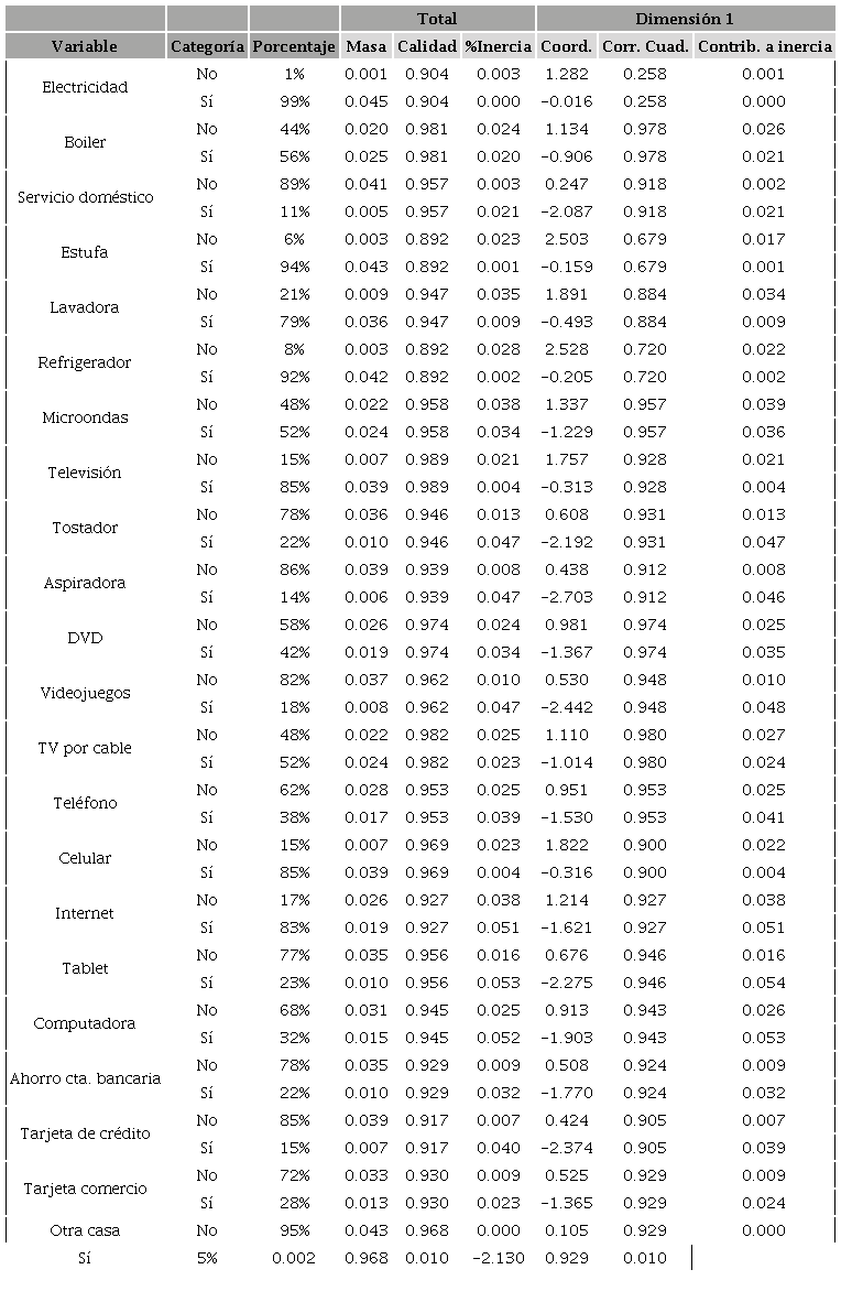 Los Cuadros A.1 y A.2 muestran el porcentaje de personas que afirmaron poseer los bienes domésticos y tener acceso a los servicios que conforman los índices de riqueza de origen y destino. Los resultados de los análisis de correspondencias múltiples indican que la variabilidad explicada por cada índice es sobresaliente: en el índice de riqueza de origen la primera dimensión explica 87.19% de la inercia total (n=14 968 obs.), en tanto que en el índice de riqueza destino la primera dimensión explica 92.30% (n=17 665). El orden de las coordenadas que determinan cómo se relacionan los ítems es positiva-negativa, donde la coordenada para la categoría ‘No’ es positiva y para la categoría ‘Sí’ es negativa. Por ello, bajo los criterios de cardinalidad, se invierten los signos del índice para trabajar con valores que dan mayor puntaje a las dotaciones de bienes y servicios más altas.