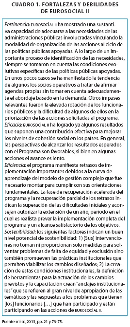 Sin pretender agotar este debate, puede ser útil sintetizar las principales conclusiones de la evaluación intermedia de Programa EUROSOCIAL II llevada a cabo por dos expertos independientes entre julio y septiembre de 2013.