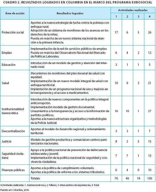 Basta señalar que Colombia participó en 136 actividades del programa (cuadro 2) que fueron llevadas a cabo en el contexto de nueve de sus diez áreas de acción, y consiguió concretar resultados consistentes en todas ellas, con especial referencia a protección social (tres resultados logrados), salud e institucionalidad democrática (cuatro resultados logrados en cada una de ellas).