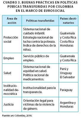 Así mismo, Colombia fue un actor relevante en la oferta de múltiples acciones de cooperación Sur-Sur, liderando ocho acciones de transferencia de buenas prácticas en políticas públicas que involucraron a ocho países de la región (cuadro 3), especialmente en lo relacionado con protección social y salud.