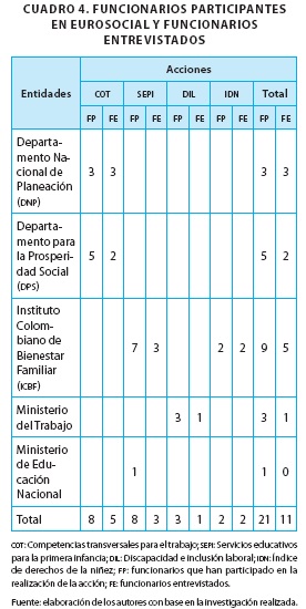 El análisis de impacto fue realizado por medio de entrevistas a los funcionarios de las entidades implicadas en la realización de las acciones antes mencionadas. El cuadro 4 especifica el número de funcionarios que participaron en la realización de las mismas y el número de funcionarios que fueron entrevistados, desglosados por acciones y entidades. Como es evidente, el muestreo incluye más de la mitad de los funcionarios directamente involucrados en la realización de las acciones tomadas en cuenta.