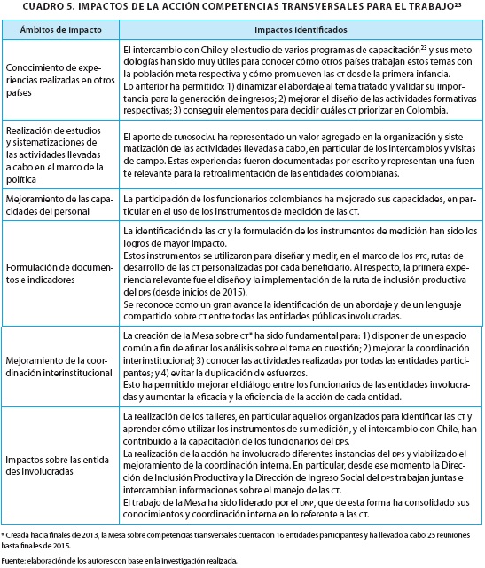 En síntesis, según los funcionarios colombianos entrevistados, los impactos positivos de las acciones realizadas en el marco del Programa EUROSOCIAL se concentran en los siguientes ámbitos temáticos y organizativos: 1) mejoramiento en el diseño y la implementación de políticas públicas, gracias a la realización de análisis, estudios e intercambios con otros países y a la elaboración de herramientas operativas; 2) fortalecimiento de la coordinación interinstitucional; y 3) aumento de las capacidades operativas de las instituciones y del personal encargados de formular y llevar a cabo las políticas sociales objeto del ejercicio.