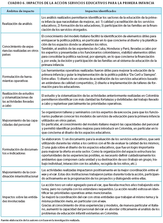 La segunda acción consistió en el mejoramiento de los Servicios educativos para la primera infancia (SEPI) (cuadro 6). Para lograr este resultado los expertos de EUROSOCIAL y los funcionarios colombianos trabajaron sobre tres ejes: 1) diseño de un sistema de calidad y del proceso de acreditación de los servicios educativos; 2) formulación de un plan integrado para la formación de los educadores implicados; y 3) implementación de un sistema de financiación de la demanda que involucre las familias como agentes activos en el proceso de calificación del sistema, con el propósito de que los servicios educativos sean reconocidos como un lugar de socialización para la comunidad local.
