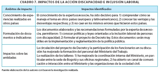 El tema de la Discapacidad e inclusión laboral (DIL) representó el eje de otra acción, cuyo propósito principal fue la formulación de un decreto para la reglamentación de la Ley 1618 de 2013 sobre inclusión laboral de personas con discapacidad (cuadro 7).