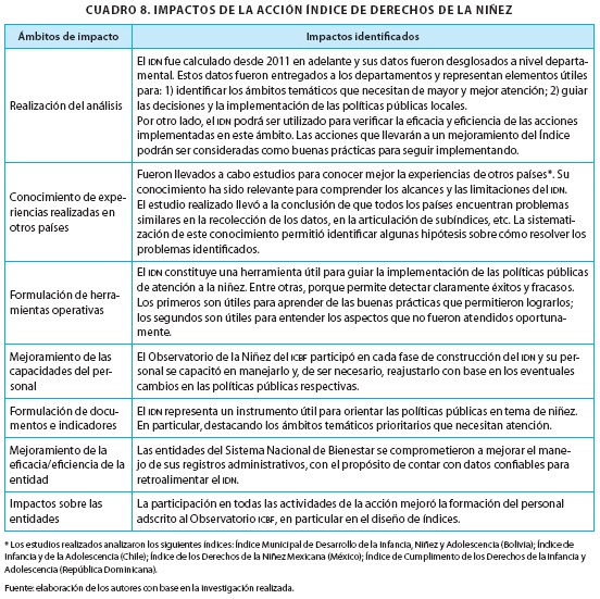 El objetivo de la cuarta acción, Índice de derechos de la niñez (IDN), fue el diseño y la implementación de un índice para medir el goce efectivo de los derechos de la niñez y guiar las decisiones de las políticas públicas respectivas (cuadro 8).