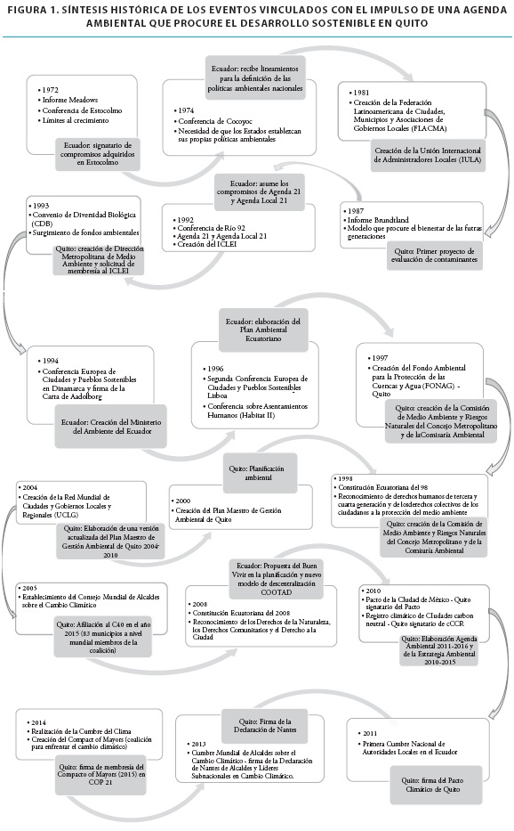 Es innegable que el año 1972 constituye un punto crítico en la política internacional ambiental, pero es en la Conferencia de Río 92 cuando se definen acciones para aportar al modelo de sostenibilidad. Con base en los compromisos suscritos en la Agenda 21 y la Agenda 21 Local se reconoce la importancia de las ciudades en la procura del desarrollo sostenible y se impulsa una ola de acciones nacionales y locales a las cuales el Ecuador se sumó por ser signatario de estos compromisos.