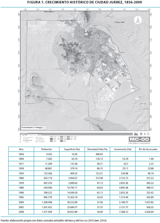 El comportamiento de la densidad de población en Ciudad Juárez refleja el crecimiento expansivo y disperso que ésta ha tenido en las últimas cinco décadas, el cual ha sido paralelo al crecimiento poblacional y la incorporación de suelo a la mancha urbana. El crecimiento urbano de Ciudad Juárez se disparó a partir de la década de los sesenta, con en un promedio de 300 hectáreas anuales en el periodo de 1960 a 1990, llegando a 1037 hectáreas anuales de 1995 al 2000, para bajar a 423,35 hectáreas en los siguientes cinco años y retomar la explosividad a 2456 hectáreas en tan solo tres años -de 2005 a 2008-, como se observa en la figura 1 (IMIP, 2010).El comportamiento de la densidad de población en Ciudad Juárez refleja el crecimiento expansivo y disperso que ésta ha tenido en las últimas cinco décadas, el cual ha sido paralelo al crecimiento poblacional y la incorporación de suelo a la mancha urbana. El crecimiento urbano de Ciudad Juárez se disparó a partir de la década de los sesenta, con en un promedio de 300 hectáreas anuales en el periodo de 1960 a 1990, llegando a 1037 hectáreas anuales de 1995 al 2000, para bajar a 423,35 hectáreas en los siguientes cinco años y retomar la explosividad a 2456 hectáreas en tan solo tres años -de 2005 a 2008-, como se observa en la figura 1 (IMIP, 2010).
