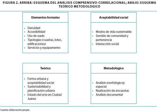 Se partió de la consideración de una serie de conceptos necesarios para alcanzar el objetivo de este análisis y ver qué aplicación tendrían en Ciudad Juárez, basándose en cinco líneas de estudio planteadas: las dimensiones de la ciudad sustentable, barrios centrales en proceso de degradación en Ciudad Juárez, desarrollo de nuevos barrios de vivienda en áreas intermedias y periféricas, normatividad en cuanto al desarrollo urbano sustentable y análisis morfológico con sistemas de información geográfica. El estudio planteado es de tipo comprensivo y correlacional, pues busca comprender las relaciones entre distintas dimensiones del desarrollo urbano sustentable, a partir del estudio de varios barrios tomados como casos de estudio, que abarquen los requerimientos para ser analizados.