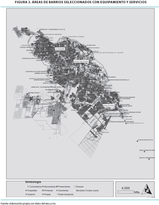 Este aspecto parece seguir la misma lógica del espacio público, la cantidad y sobre todo la diversidad de oferta parecen ser la clave, pues aunque en términos de la dotación recomendada por Sedesol, los tres barrios cumplen, si no en su interior, al menos en un radio de 30 minutos, en La Chaveña no solo hay cantidad, sino diversidad de equipamiento, oferta que disminuye en 50 % en el barrio intermedio y en alrededor de un 90 % en el barrio periférico: en La Chaveña existen 30 facilidades de servicios y equipamientos (hospitales, escuelas, parques, supermercados, funerarias, comercios, entre otros), el Infonavit Casas Grandes cuenta con 15 facilidades de este tipo y Parajes de Oriente, solo con 5 facilidades (una tienda de conveniencias Del Río, dos preescolares y dos primarias). Esta población, de 7063 ha bitantes, no cuenta con ningún servicio de salud o puesto de socorro en la proximidad.