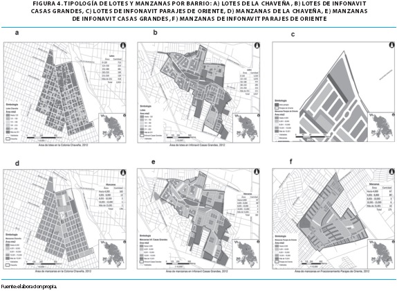 En el Infonavit Casas Grandes, predominan los lotes de hasta 120 m2, con algunas zonas con lotes de 151 a 180 m2, y los de más de 211 m2 corresponden a áreas de donación y parques. De modo que se puede decir que, comparado con La Chaveña, presenta mayor densidad habitacional y menor mezcla variada de tamaños y tipos de lotes. Predominan las manzanas que cubren una superficie hasta los 4000 metros cuadrados. Se trata de una forma urbana semirregular y proyectada, con una mezcla de calles curvas y lineales, que crean núcleos de viviendas dentro del barrio (figura 4 b y e).