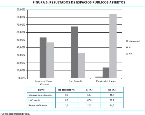 La diversidad parece ser nuevamente la clave, pues aunque hay mayor cantidad de terreno dedicado a ello en los barrios intermedio y periférico, se identificó mayor diversidad y apropiación por parte de los habitantes (orgullo, uso, reconocimiento) en La Chaveña. Se verificó que 67,6 % de los habitantes de La Chaveña afirman que les gustan los espacios públicos abiertos que existen en su barrio; en Infonavit Casas Grandes respondieron afirmativamente el 53,3 % de los habitantes y en Parajes de Oriente solo el 13,7 % manifiesta sentir agrado por este tipo de lugares. El resultado en Parajes de Oriente es un poco grave, sobre todo, considerando que es el barrio más reciente, con más población y mayor nivel de hacinamiento, donde los habitantes necesitan aún más de un lugar de esparcimiento como complemento a la vivienda. En el caso se La Chaveña, los habitantes usan el lugar para ocio y se sienten identificados con el espacio público como un símbolo que caracteriza su barrio, y en Infonavit Casas Grandes realizan actividades deportivas y mantienen cierta convivencia, cosa que no ocurre en Parajes de Oriente, donde los usuarios expresaron sentirse intimidados por los maleantes que frecuentan estos espacios, así como por el grave deterioro de los mismos (figura 6).