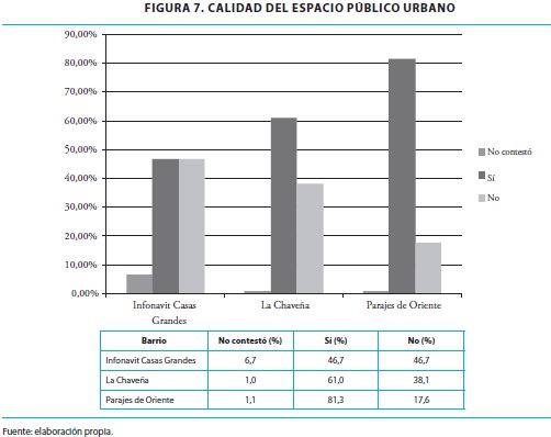 elaboracion propiaAcompañando el resultado sobre los espacios públicos, la calidad del espacio urbano representa un gran desafío en los tres barrios, especialmente en el localizado en la zona periférica. En Infonavit Casas Grandes, el 46,7 % de la población no está satisfecha con la calidad de las calles y banquetas, y por la presencia de baldíos; este porcentaje aumenta a 61 % en La Chaveña y en Parajes de Oriente alcanza el 81,3 % de la población (figura 7).