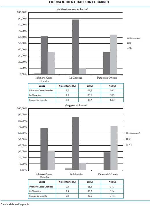 Se encontró que existe una relación entre los elementos formales de la ciudad, en este caso a nivel escala de barrio, y la pertenencia, aceptabilidad y permanencia en los barrios con más antiguedad (de los casos de estudio), en especial con relación a algunos de los elementos simbólicos como los parques, plazas o escuelas, que son parte de lo que los habitantes y usuarios de estas zonas hacen referencia en su vida diaria. El contexto inmediato es el referente que los usuarios siempre solían mencionar y hacer remembranzas, así como contar anécdotas o hacer sugerencias, porque es donde llevan a cabo la mayoría de sus actividades. El estudio del nivel de identificación de los habitantes con sus barrios arrojó que en La Chaveña el 88,6 % de los encuestados se sienten identificados con su barrio, y en Infonavit Casas Grandes el 61,7 %; sin embargo, en Parajes de Oriente solo el 35,7 % dicen identificarse, o sea, aproximadamente 4541 habitantes no se identifican con el lugar en que residen. La relación que existe en estos resultados coincide con el tiempo de creación que tienen los barrios, en el sentido de que se observa mayor identificación de los habitantes con el barrio más antiguo, donde es de destacar que los habitantes han construido sus viviendas a su gusto, a diferencia de Infonavit Casas Grandes y Parajes de Oriente, ambos barrios desarrollados a partir de tipologías arquitectónicas y de diseño urbano apoyadas por las políticas de vivienda de los últimos cuerenta años, donde es más limitada la posibilidad de la autogestión y autoconstrucción de las viviendas por parte de sus propietarios. Este resultado se corroboró con la pregunta acerca de si les gusta su barrio, donde el resultado es semejante, o sea, acompaña el tiempo de creación de dichos barrios: respondieron afirmativamente un 90 % de los encuestados en La Chaveña, seguido de Infonavit Casas Grandes donde se alcanza un 68,3 % y solo 28,6 % en Parajes de Oriente (figura 8).