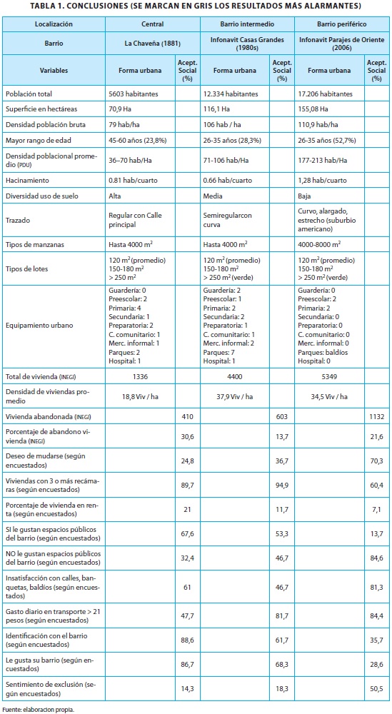 b) intermedio y periférico: se detectó mayor densidad y hacinamiento, menor diversidad de usos de suelo y de tamaño, y tipos de lotes y viviendas, menor cantidad y diversidad de equipamiento público y espacio público, aunque ambiguamente existe mayor espacio disponible para esos usos en las áreas de dotación, menor diversidad de opción de vivienda y renta, mayor deseo de abandono.