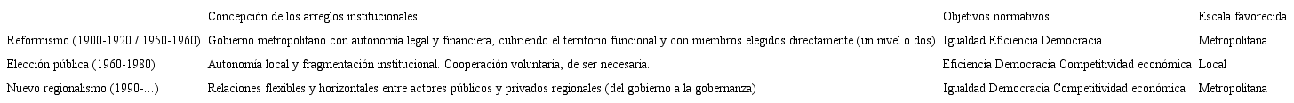 Desde la ciencia política existen cuatro escuelas que abordan la gobernanza metropolitana: la del gobierno metropolitano o viejo regionalismo, la de la elección pública o policentrismo, el denominado nuevo regionalismo, y la escuela del reajuste y la reterritorialización (rescaling and reterritorialization)9 (Savitch y Vogel, 2009). Cada una de estas perspectivas teóricas está relacionada con una concepción de la "mejor" solución institucional al problema metropolitano de la no corrección de externalidades, y el desaprovechamiento de economías de escala en la producción de bienes y la provisión de servicios públicos, es decir que, además de describir, tiene aspiraciones prescriptivas (Tomás, 2012).