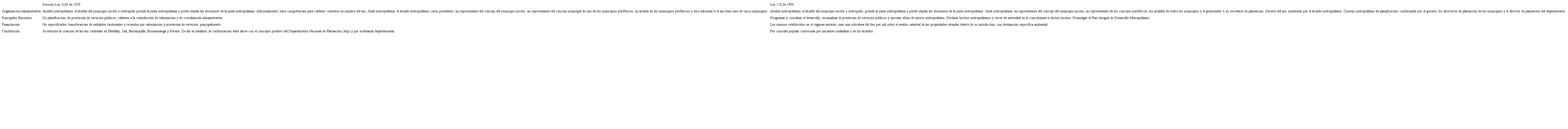 Como entidades jurídicas, las áreas metropolitanas (am) en Colombia comienzan con la reforma constitucional de 196812, que permite su creación, pero no reglamenta su funcionamiento. Solo hasta la promulgación del Decreto-Ley 3104 de 1979 se concretarán las condiciones para la creación y el funcionamiento de las áreas metropolitanas. Posteriormente, la Ley 128 de 1994 genera disposiciones específicas concernientes a las capacidades, la organización administrativa y los ingresos de las am en el país. Sin el ánimo de presentar exhaustivamente las características de cada marco normativo, la tabla 2 resume los principales elementos del Decreto-Ley 3104 de 1979 y la Ley 128 de 1994 en cuanto a la organización administrativa, funciones, financiación y requisitos para la constitución de las am (tabla 2).