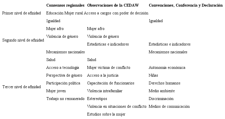 Si esta misma lectura se hace teniendo en cuenta una distinción entre las tres familias de documentos (consensos regionales, observaciones de la CEDAW y las convenciones), los resultados empiezan a mostrar las primeras diferencias en relación con ciertos temas, consignadas en la tabla 1. Los temas fueron agrupados por niveles de afinidad, siendo el primero el que recoge los asuntos que sugieren ser los más presentes en los discursos contenidos en los tres grupos de documentos. A continuación, en el segundo nivel de afinidad se ubican los temas que sugieren ser sobresalientes en al menos dos grupos de documentos. Finalmente, en el tercer nivel de afinidad se ubican otros temas que, estando presentes en los tres grupos de documentos, sugieren recibir una prioridad distinta en los tres universos.