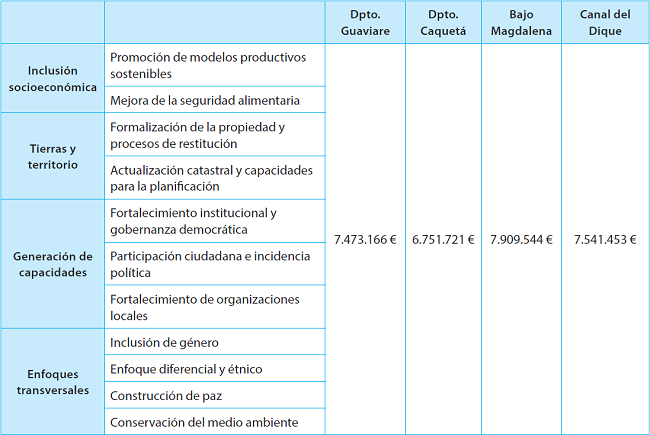 Con esta lógica de intervención, NTP concentra sus inversiones en cuatro regiones altamente afectadas por el conflicto armado; vincula durante la implementación a entidades públicas, organismos internacionales, sociedad civil y academia, y plantea la siguiente lógica de intervención, la cual guarda muchos paralelismos con la estructuración de los acuerdos, principalmente en lo que se refiere al punto 1 de reforma rural integral, y la formulación e implementación de los PDET (tabla 1).