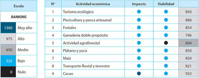 Por consiguiente, la valoración de las actividades económicas se hizo través de una metodología cualitativa y cuantitativa. La medición del impacto y la viabilidad se realizó mediante siete y seis preguntas respectivamente, a partir de las cuales se asignó una valoración cuantitativa tomando como referencia una escala de 0 a 1300. Como resultado de la ponderación de puntajes obtenidos en cada mesa de trabajo se obtuvo el siguiente ranking de actividades productivas (tabla 1).