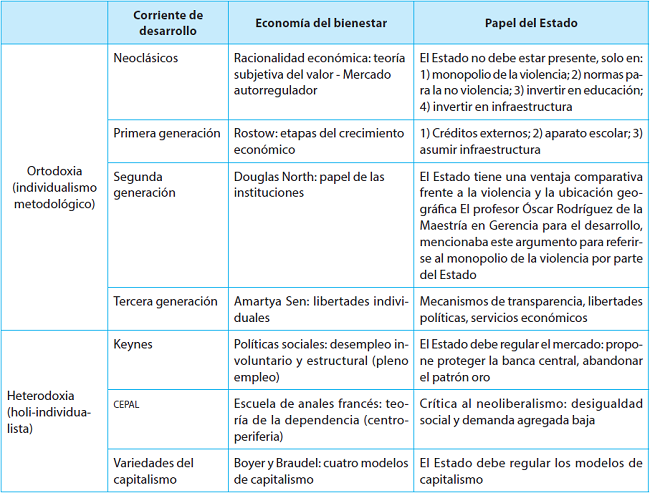 Con el ánimo de lograr una mayor claridad teórica, en la tabla 1 se presentan, a modo de resumen, las corrientes de desarrollo desde las visiones de la ortodoxia y la heterodoxia, con los principales planteamientos teóricos esbozados durante el desarrollo del artículo.