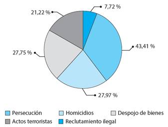 Lo anterior fue reiterado por la Defensoría del Pueblo (2017), que destacó las violaciones de los derechos humanos que se continúan perpetrando en la zona de frontera colomboecuatoriana, entre las que se encuentra, en primer lugar, la persecución (43,41 %); los homicidios ( 27,97 %); el despojo de bienes (27,75 %); los actos terroristas (21,22 %); y el reclutamiento ilegal (7,72 %). La figura 1 muestra los datos mencionados.