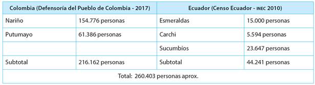 La migración transfronteriza que se pretende analizar aquí tiene lugar entre los departamentos de Nariño y Putumayo (Colombia) y Carchi, Sucumbíos y Esmeraldas (Ecuador); zona colindante de 586 km de longitud que va desde el litoral pacífico hasta la selva amazónica, donde además se presenta una concentración considerable de población étnica compuesta por comunidades afros e indígenas.