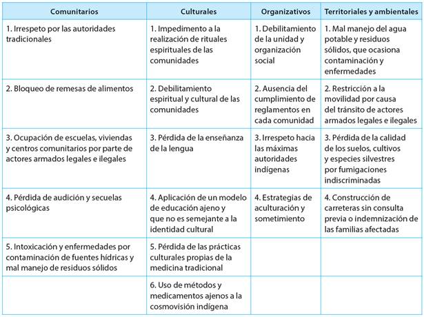 Todo esto permite reconocer algunas consecuencias que trae la dinámica de migración transfronteriza forzada. Dada la interdependencia de los indígenas con su territorio, el despojo del mismo contribuye a la pérdida del espacio comunitario donde se desarrollan las actividades culturales y económicas tradicionales, su autonomía y justicia propia bajo su cosmovisión. A este respecto, la migración transfronteriza forzada de las comunidades indígenas aumenta, a la vez que se violenta su relación con el territorio ancestral debido a la ruptura del entorno propio y el impacto cultural, lo que desemboca en daños y afectaciones en diversos niveles, tal como lo muestra la tabla 2.