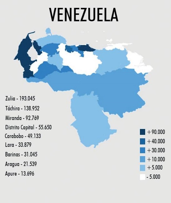 Según datos del Instituto Nacional de Estadística (2014) (mapa 1), la distribución territorial de la diáspora colombiana en Venezuela se ha caracterizado por ubicarse en zonas de frontera, lo cual evidencia la continuación de las tendencias de comunicación transfronteriza de los colombianos residentes en este país. Se destaca la presencia de colombianos en los estados federales de Zulia (193.045), Táchira (138.952), Miranda (98.769) y Carabobo (49.133), además de contar con una presencia relevante en el Distrito Capital (55.650), y en los estados de Lara (33.879), Barinas (31.045), Aragua (21.539), Bolívar (14.639) y Apure (13.696).