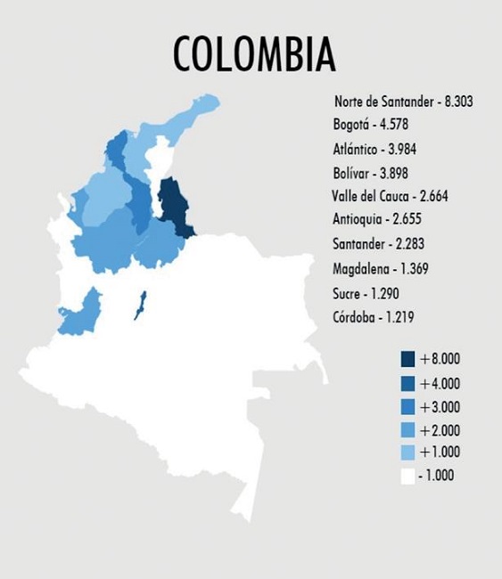 De acuerdo con Santana (2009) (mapa 2), la dispersión territorial de la migración venezolana en Colombia se asentaba principalmente en la región fronteriza con el Táchira venezolano, al igual que una presencia disgregada en la región Caribe y en las grandes urbes del país. Se destaca la presencia de venezolanos en los departamentos de Norte de Santander (8.303), Distrito Capital de Bogotá (4.578), Atlántico (3.984), y Bolívar (3.898), además de contar con una presencia relevante en el Valle del Cauca (2.664), y en los departamentos de Antioquia (2.655), Santander (2.283), Magdalena (1.369), Sucre (1.290) y Córdoba (1.219). No obstante, si comparamos estos registros con los nuevos referentes estadísticos aportados por el Registro Administrativo de Migrantes Venezolanos (RAMV) (2018), es posible evidenciar que el fenómeno migratorio venezolano mutó de estar en una dimensión fronteriza, a ser una población de profundo impacto a lo largo de la geografía nacional, sin mencionar un incremento exponencial del número de venezolanos en Colombia, el cual registra 442.462 personas para 2018, cifra histórica en los registros migratorios. Dentro de la nueva configuración (Gobierno de Colombia, 2018) (mapa 3), aunque se mantiene una fuerte presencia de venezolanos en departamentos fronterizos como Norte del Santander (82.286) y La Guajira (74.874), se resalta una presencia de mayor calado en departamentos de gran peso demográfico como Atlántico (42.771), Bogotá (43.483), Antioquia (21.850) y Valle del Cauca (16.572); niveles que superan ampliamente a los registros anteriores.