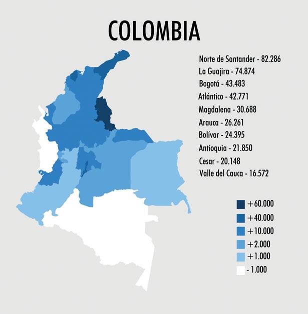 No obstante, el progresivo deterioro de las condiciones de vida en Venezuela, al igual que la presencia de realidades coyunturales que pueden distorsionar la revisión estadística tales como la porosidad fronteriza, los sistemas de registro migratorio débiles en los diversos complejos fronterizos venezolanos, la irregularidad migratoria, entre otros, pueden distanciar las cifras anteriormente expuestas de una realidad plausible. Por ejemplo, hay estimaciones de la salida de más de 4’091.717 de venezolanos al exterior (Consultores 21, 2017), de las cuales se estimó la presencia de 550.000 por parte de las autoridades migratorias colombianas (El Tiempo, 2018). Sin embargo, la dimensión real de la diáspora venezolana, a causa de una multiplicidad de elementos que impiden tener una perspectiva clara de este fenómeno, no puede ser plenamente dimensionada en la actualidad. Además, gran parte de la población venezolana en Colombia obedece a una tendencia migratoria flotante que tiende a moverse en la frontera, el 34 % desarrollan patrones de movimiento transfronterizo de corta duración de forma pendular, y el 66 % de tránsito con miras a desplazarse hacia otros países como Panamá, Ecuador, Perú, Chile, Argentina y Estados Unidos (Migración Colombia, 2018, p. 7).
