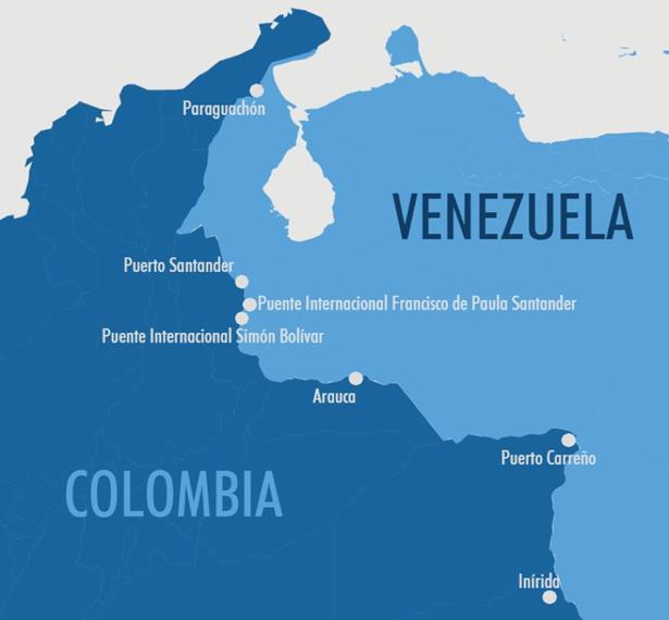 La frontera colombo-venezolana se extiende por más de 2.200 km, y delimita los departamentos de La Guajira, Cesar, Boyacá, Norte de Santander, Arauca, Vichada y Guainía, del lado colombiano de la frontera, y Zulia, Táchira, Apure y Amazonas como estados fronterizos venezolanos. Esta frontera, cuenta con siete pasos fronterizos autorizados, tanto terrestres como fluviales, estos son: los puentes internacionales Francisco de Paula Santander, Simón Bolívar y La Unión, en Cúcuta; el Puente Internacional José Antonio Páez en Arauca; el paso en Paraguachón, La Guajira; y los muelles de los ríos Inírida-Guaviare-Atabapo en Guainía y Orinoco en Puerto Carreño, Vichada (mapa 4).