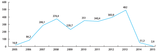 Por otro lado, durante los últimos once años, las remesas enviadas desde Venezuela se han caracterizado por ser uno de los focos de ingresos de divisas más importantes de la economía colombiana. En este contexto, y dadas las progresivas restricciones económicas que siguieron luego del gran periodo de bonanza petrolera entre 2006 y 2013, el panorama sobre las remesas refleja el mismo fenómeno de las migraciones laborales. Según cifras del Banco de la República (2016) (figura 2), en un periodo de dos años se pasó de registrar un ingreso de 492 millones de dólares en remesas provenientes desde Venezuela, a registrar solamente 2,6 millones de dólares para 2015. Los anteriores elementos demuestran que, si bien la importancia de Venezuela como un destino tradicional de migración para Colombia mantiene vigencia, los recientes sucesos económicos y políticos han provocado un progresivo escenario de reducción del caudal migratorio e, incluso, la generación de un proceso de retorno.