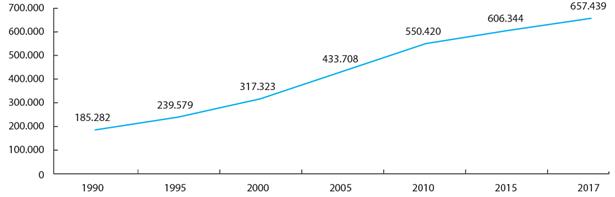 De acuerdo con registros de Naciones Unidas (2017), la evolución del número de venezolanos residentes en el extranjero ha crecido progresivamente durante los últimos treinta años, cuando se ha pasado de 185.282 venezolanos en el extranjero para 1990, al registro de 606.344 para 2015 y 357.439 para 2017 (figura 3). En Colombia, las migraciones venezolanas durante los últimos treinta años han sido de proporciones modestas. Acorde con los registros de Naciones Unidas (2017), para 1990 había 33.123 venezolanos residentes en Colombia. A partir de dicho registro, el crecimiento de esta población tendió a crecer de forma ralentizada; así, en el año 2000 pasó a 37.200, y para 2015 se percibió la presencia de 46.614. En términos porcentuales, la población venezolana en Colombia solo incrementó sus dimensiones en un 40 % dentro de un lapso de 25 años (tabla 6).