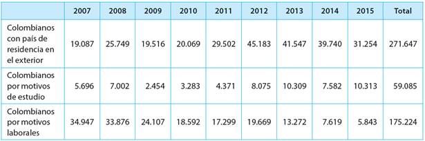 Por un lado, dentro de los flujos migratorios de colombianos hacia Venezuela (tabla 5) se han realizado 271.647 salidas de colombianos que declararon residir en el exterior entre 2007 y 2015. En dicho periodo se registraron picos en el año 2012, con 45.183 movimientos hacia Venezuela llevados a cabo por personas con la caracterización mencionada; cifra que posteriormente se reduciría en un 31 % en comparación con los registros de 2015.