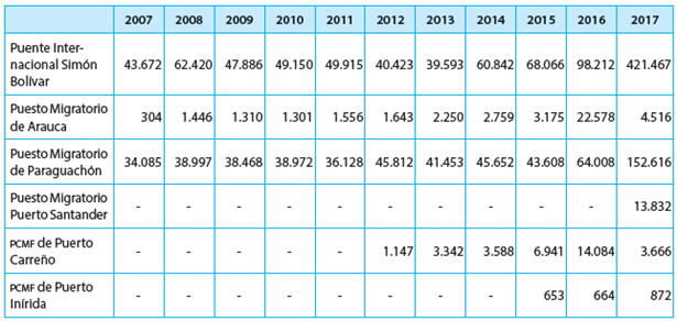 Por ejemplo, de acuerdo con registros de la Unidad Administrativa Especial Migración Colombia (2017), una parte considerable de los flujos migratorios de entrada de venezolanos se registraron por vía terrestre; cifras que han percibido incrementos sensibles durante los últimos cinco años. De acuerdo con registros de esta Unidad (tabla 7), el número de venezolanos entrantes al país ha experimentado crecimientos considerables; el Puente Internacional Simón Bolívar en Cúcuta pasó de registrar 39.593 entradas de venezolanos para 2013, a percibir 98.199 en 2016, lo cual significa un crecimiento de 148 % en un lapso de cuatro años.