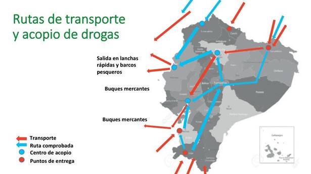 La apuesta de los organismos de seguridad de Colombia y Ecuador ha sido mantener el escenario de actividades ligadas al narcotráfico por parte de bandas delincuenciales que operarían en los departamentos de Nariño y Putumayo en Colombia, y en las provincias de Esmeraldas, Carchi y Sucumbíos en el Ecuador. El mapa 1 muestra las rutas del transporte de drogas en las fronteras norte y sur del Ecuador, y también a nivel marítimo.