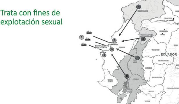 Para matizar la lógica argumental, en el mapa 2, y con base en datos del sistema de inteligencia policial ecuatoriano, se puede evidenciar la presencia de redes de tráfico de personas que operarían en Perú, Ecuador y Colombia con fines de explotación sexual. Estas estructuras estarían compuestas por las mismas bandas de narcotraficantes que le “apuestan a otros negocios ilícitos” (Carrión, 2012).