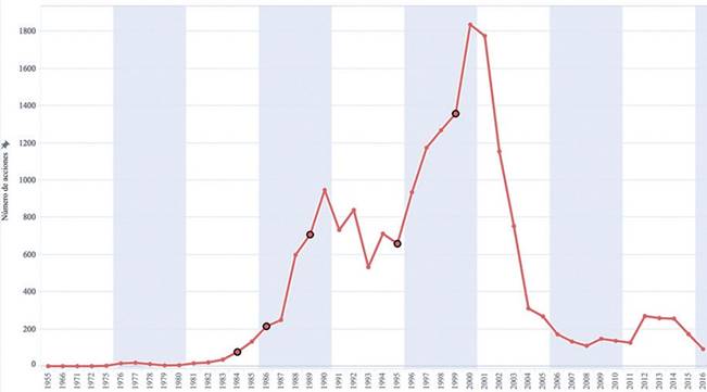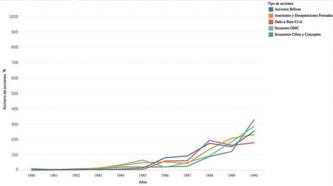 En primera instancia se evidencia que, hasta la década de los ochenta, con la llegada de la Mannessmann (año señalado con el primer punto en la línea de la figura 1), el ELN adquiere la capacidad financiera de aumentar el número de acciones y consolidarse como actor armado del conflicto colombiano. El grupo se enfrentaba en aquel momento a dificultades económicas, y a pugnas y fusilamientos en su interior que amenazaban con desaparecerlo, pero gracias a las rentas de la extorsión a empresas petroleras, y al millonario pago del rescate de los ingenieros europeos secuestrados, el ELN logró recaudar cerca de 3.000 millones de pesos, lo que lo convirtió en uno de los grupos con mayor ingreso per cápita del planeta (Semana, 1999). Dichos ingresos le permitirían, en el marco de la mencionada campaña “Vida y soberanía Manuel Gustavo Chacón”, ampliar sus acciones contra la infraestructura petrolera y aumentar su iniciativa bélica en la confrontación (figura 2).