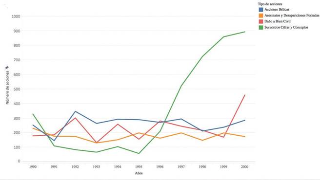 De hecho, al revisar los tipos de acciones de la década (figura 2) se entiende que, a partir de 1985, la ascendente participación del ELN se limita a acciones bélicas y daños a bienes civiles, justificados en la voladura de oleoductos y otros atentados a la industria extractiva. Adicionalmente, se evidencia un escalamiento hacia el año 1988, cuando el Gobierno presentó su Iniciativa para la Paz; el ELN no se interesó en los diálogos de paz y, en cambio, decidió atacar los pilares de la economía nacional (industria petrolera). Así, la dinámica de las acciones ejecutadas por esta guerrilla durante los años ochenta respondió a la estrategia que muchos dieron en llamar “petroterrorismo”: “lo que en un principio se presentó como su bandera en defensa de la soberanía nacional y los recursos no renovables, se fue transformando en su más poderosa arma en la confrontación y principal fuente de financiamiento” (Echandía, 2015). Por su parte, la década de los noventa inicia con un repunte de las acciones bélicas y de los daños a bienes civiles (1992), justificado por el fracaso de los diálogos de paz con la administración Gaviria y la consecuente agudización del conflicto (Echandía, 2015). Sin embargo, la dinámica más significativa de la década corresponde a los secuestros, cuyo ascenso a partir de 1996, con un pico en 1999, responde directamente al plagio de Brigitte Schönne (1996), el avión de Avianca y la congregación de La María (1999). No sobra recordar que, en el marco de la estrategia de internacionalización hacia Europa, el ELN justificó esta ola de secuestros como un medio de presión al gobierno Pastrana para entablar negociaciones de paz (figura 3).