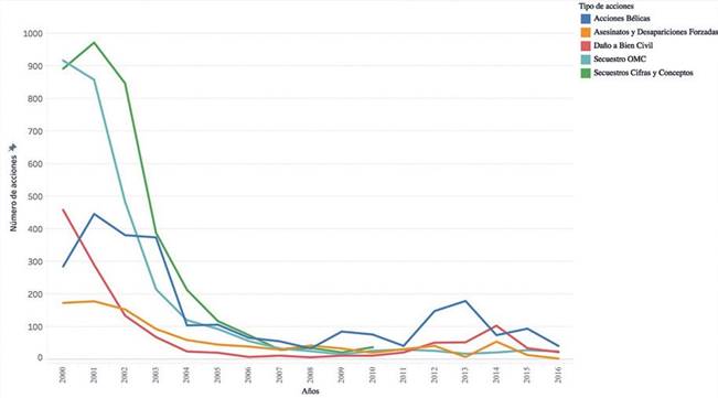 Al periodizar el histórico de acciones llevadas a cabo por iniciativa del ELN, es posible revisar el posible impacto de la estrategia de internacionalización sobre la dinámica del conflicto colombiano y, en particular, sobre las condiciones de seguridad fronteriza, representadas en acciones de impacto humanitario6 como las registradas por el OMC (figura 1).